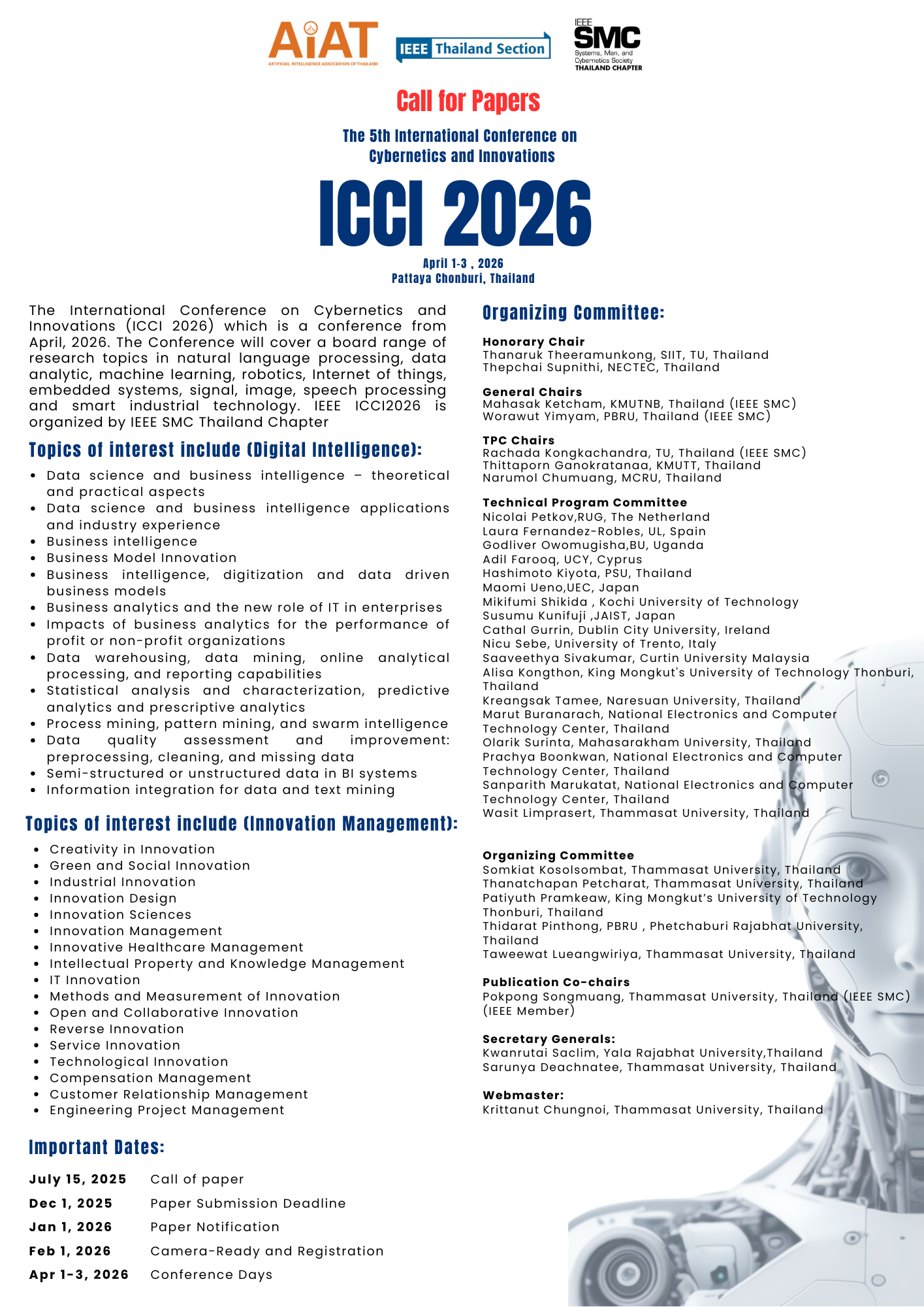 The International Conference on Cybernetics and Innovations (ICCI 2026) which is a conference from April, 2026. The Conference will cover a board range of research topics in natural language processing, data analytic, machine learning, robotics, Internet of things, embedded systems, signal, image, speech processing and smart industrial technology.